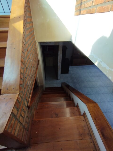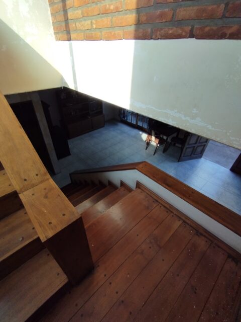 ESCALERA REVESTIDA EN MADERA con acceso a la planta alta y espacio guarda objetos debajo.